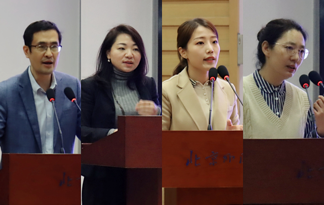 来自中国人民大学pg娱乐电子游戏官网入口的宋友文教授以及北外pg娱乐电子游戏官网入口的张曼、刘菁、韩雪青三位教师分别进行了说课展示。宋友文以“如何培养理论思维?——读原著、学原文和悟原理”为题,从什么是理论思维、培养理论思维为何重要、怎样培养理论思维三个方面生动讲述了如何引导学生认清社会发展大势,做到理论上清醒,政治上坚定。张曼以《马克思主义基本原理》第三章第三节《人民群众在历史发展中的作用》的教学为例,围绕人民群众概念辨析、辩证看待人民群众创造历史过程中的作用等问题,展示了从案例导入、理论分析到拓展总结的教学过程。刘菁以《思想道德与法治》课教学中的社会热点为切入点,示范了如何通过社会热点事件和案例来引导学生正确认识中国特色社会主义法治道路和树立法治思维,并展示了自己在丰富思政课教学方法方面所作的尝试。韩雪青以《毛泽东思想和中国特色社会主义理论体系概论》课中“发展社会主义民主政治”为主题,围绕民主是社会主义的生命、坚持走中国特色社会主义政治发展道路、健全人民当家作主制度体系这三个层面展开理论阐释,落脚于坚定对中国特色社会主义政治制度的自信。