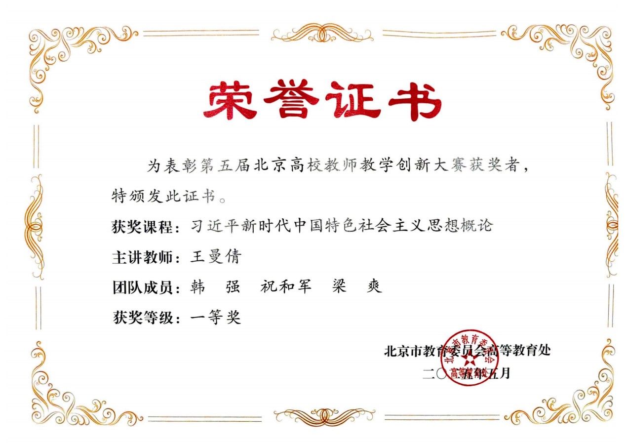 近日,北京市教育委员会发布了《关于公布第五届北京高校教师教学创新大赛获奖名单的通知》,经严格评审,由王曼倩主讲,韩强、祝和军、梁爽三位团队成员参与的《习近平新时代中国特色社会主义思想概论》课程获评新文科正高组一等奖,并推荐参加国赛,实现了学校在该项比赛上获奖等级的新突破。