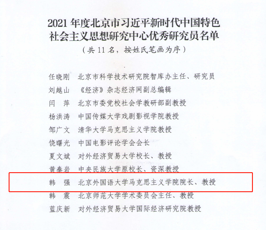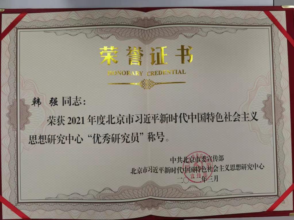 3月24日,北京市习近平新时代中国特色社会主义思想研究中心召开2021年工作总结暨2022年工作部署会,会议通报了2021年度北京市习近平新时代中国特色社会主义思想研究中心研究基地工作情况,并评选了2021年度北京市习近平新时代中国特色社会主义思想研究中心优秀研究员、优秀工作者和优秀研究基地,pg娱乐电子韩强教授获评2021年度北京市习近平新时代中国特色社会主义思想研究中心优秀研究员。