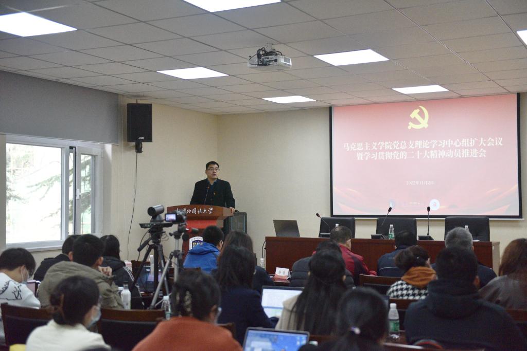 为深入学习贯彻党的二十大精神,研究部署当前及下一阶段重点工作,11月2日上午,pg娱乐电子游戏官网入口党总支召开党总支理论学习中心组扩大会议暨学习贯彻党的二十大精神动员推进会,学院全体党员,党员发展对象、入党积极分子参加会议。会议明确,学院将坚决按照学校党委的统一部署,坚持“马院姓马,在马言马”的鲜明导向和首要原则,紧密结合学院工作实际,对党的二十大精神做到学用贯通、知行合一。一方面,要加强党组织理论学习,充分利用党总支理论学习中心组、专题党课等活动加强学习,创新学习形式,拓展学习路径,准确把握党的二十大精神实质和丰富内涵;另一方面,要结合党的二十大精神加强业务学习,将党的二十大精神全面融入思政课建设、学科建设和科学研究。