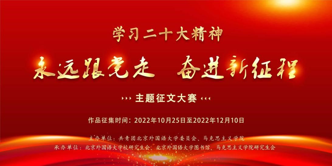 青春心向党,奋进新征程。为深入学习贯彻党的二十大重要讲话精神,进一步深化思想政治引领,引领北外学子坚定不移听党话、跟党走,努力成为有家国情怀、有全球视野、有专业本领的复合型人才,pg娱乐电子联合校团委共同举办“学习二十大精神·永远跟党走、奋进新征程”主题征文大赛,促进学生通过生动的语言文字表达对党的深厚情感、讴歌新时代取得的辉煌成就,充分展现pg娱乐电子学子善学习、找方向、勇担当的精神风貌,推动二十大精神学习交流。