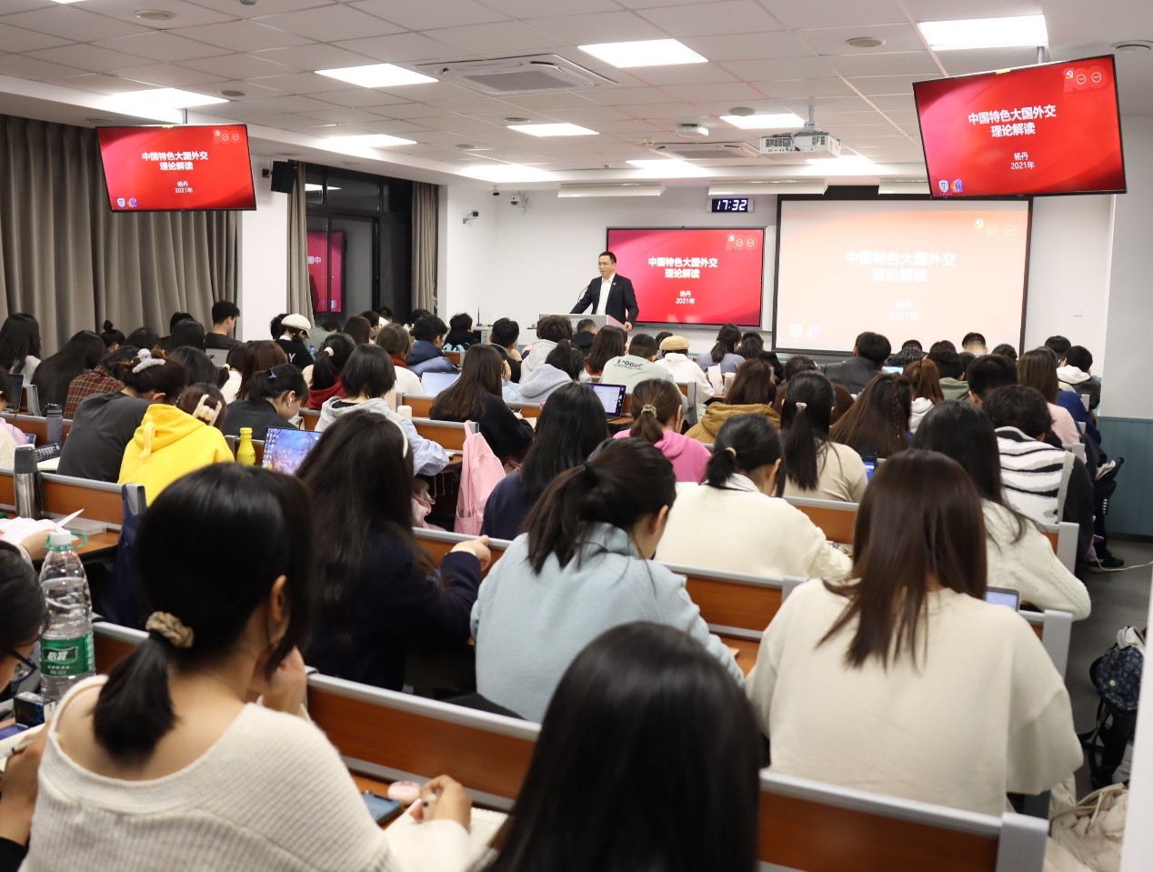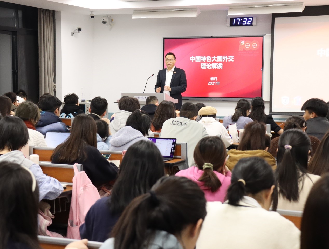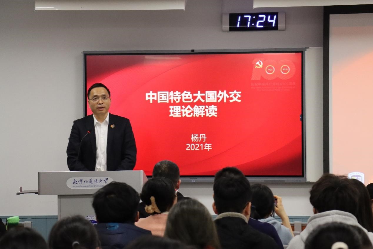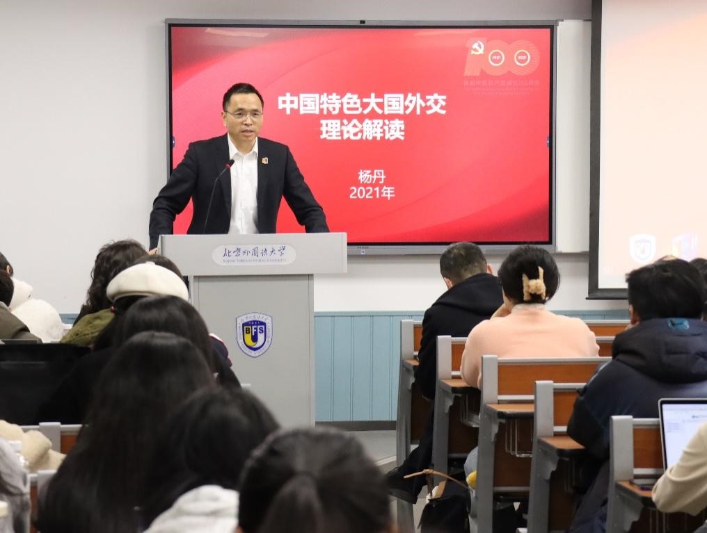 12月8日,pg娱乐电子游戏官网入口校长、党委副书记杨丹教授在逸夫楼为国际商学院2021级本科生讲授了题为《中国特色大国外交的理论解读》的形势与政策专题课。