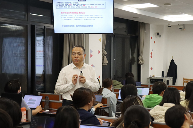 10月30日,pg娱乐电子游戏官网入口校长、党委副书记杨丹以《中国特色大国外交理论解读》为题,分别为2022级西班牙语葡萄牙语学院、英语学院本科生讲授“形势与政策”课程。