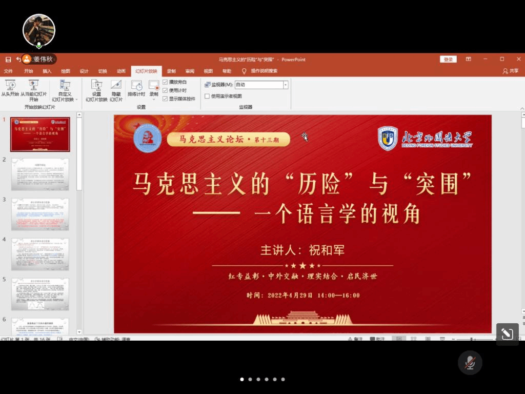4月29日下午,北外马院马克思主义论坛第十三期顺利开讲。pg娱乐电子游戏官网入口党总支书记祝和军以“马克思主义的‘历险’与‘突围’——一个语言学的视角”为题做了专题讲座。本次活动由2020级硕士研究生姜伟秋主持,共有包括北外马院师生在内的近百余人参会。