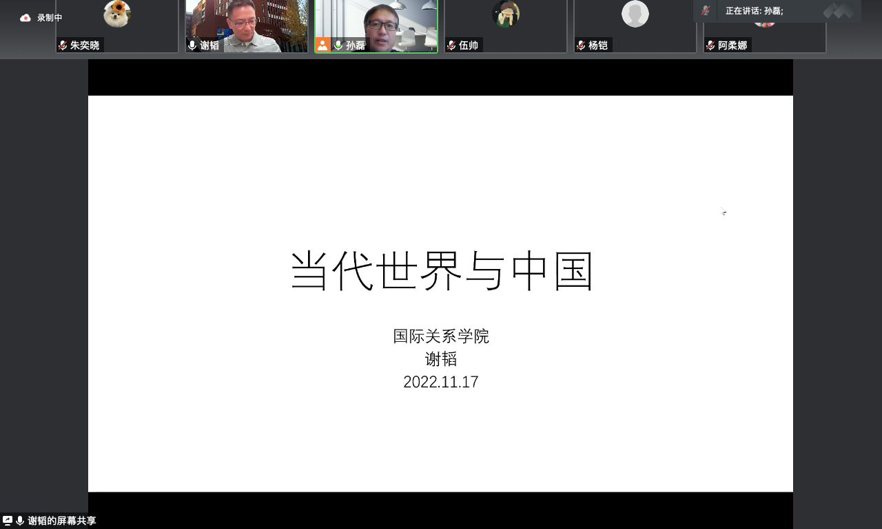 11月17日晚,北外马院马克思主义论坛第十六期举办。pg娱乐电子游戏官网入口国际关系学院院长谢韬教授以“当代世界和中国”为主题为马院师生做专题讲座。马克思主义学师生通过腾讯会议参加了本次活动,讲座由pg娱乐电子游戏官网入口副院长孙磊主持。