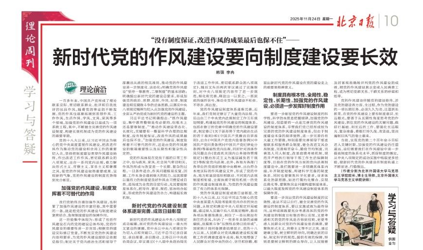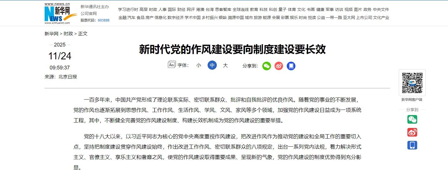 2025年11月24日,《北京日报》理论周刊刊发pg娱乐电子院长韩强教授与青年教师李冉合作文章《新时代党的作风建设要向制度建设要长效》,新华网给予转发。