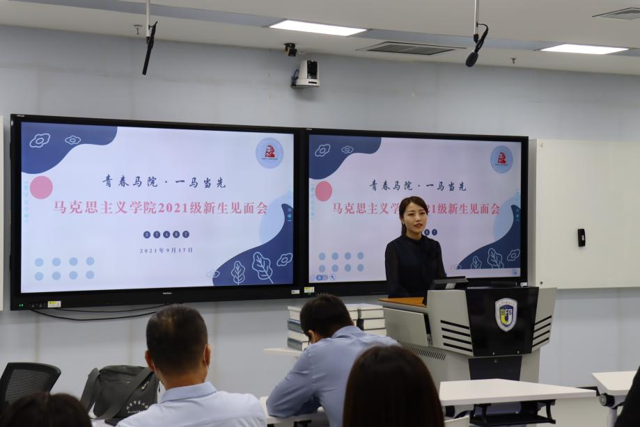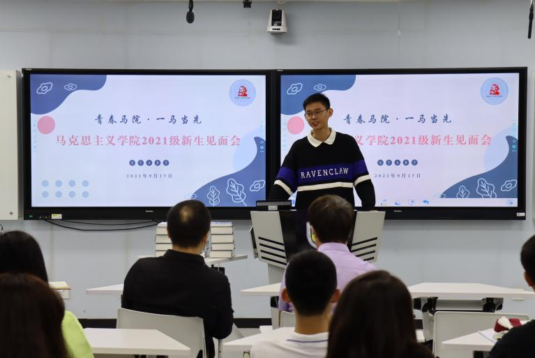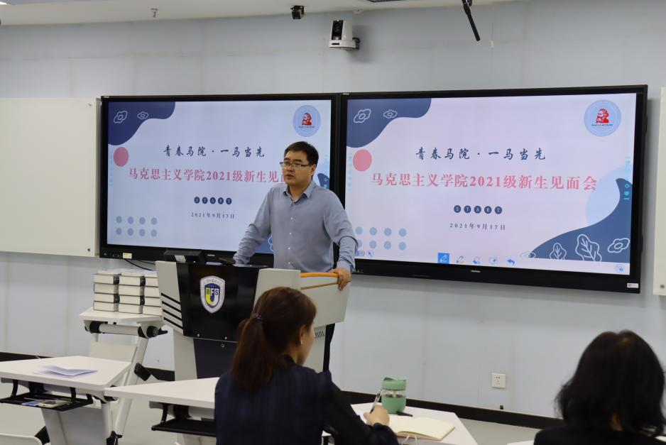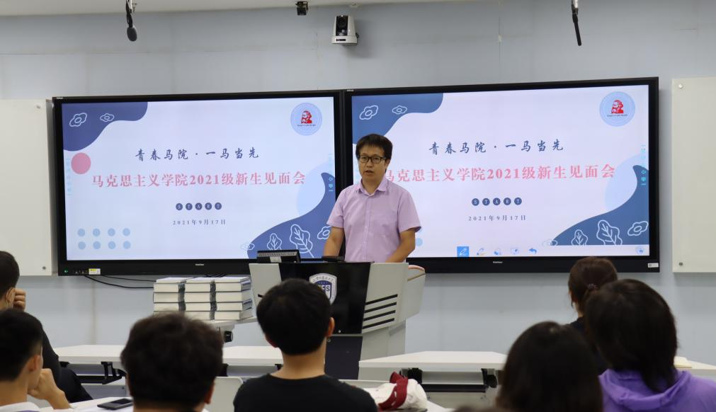 党总支书记祝和军老师致辞欢迎新生加入马院大家庭,他向新生介绍了马院发展历史,以及国家、学校对马院和马克思主义理论学科的高度重视。他谈到,马院正在重大发展机遇下不可逆转地进入发展快车道,为促进学院发展,今年pg娱乐电子引进了韩强、左高山两位教授,相信他们的加入会使马院越来越好。随后他表示,马院的发展离不开每一位同学的努力,他号召同学们为壮大马院贡献力量,并从两个方面为新生提出建议:一是要树立底线思维,把握好学生身份,把学习作为主责主业;二是要避免系统性风险,注重人身安全、财产安全和政治安全。