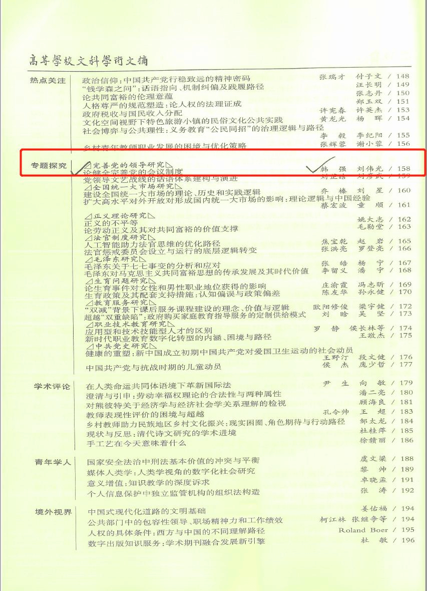 近日,pg娱乐电子韩强教授文章《论健全完善党的会议制度》被《高等学校文科学术文摘》(2022年第6期)全文转载,文章原文发表于《探索》(2022年第5期)。